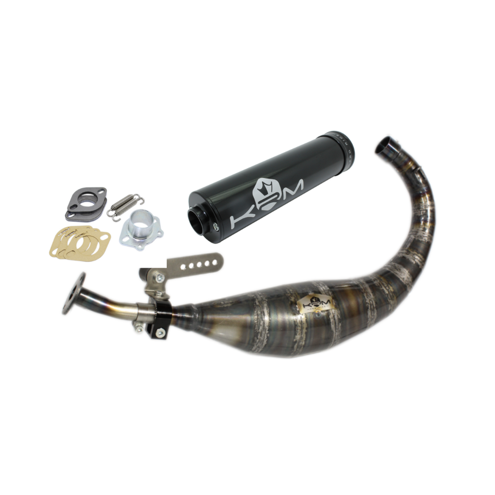 De KRM Uitlaat Zwart 70–78cc Derbi is een hoogwaardige performance-uitlaat, speciaal ontwikkeld voor Derbi 70cc en 78cc race- en tuningsets. Dankzij het geoptimaliseerde expansiedesign levert deze uitlaat een krachtige powerband, extreem snelle gasrespons en maximale topkracht. De demper heeft een strakke zwarte afwerking en geeft bovendien een agressieve, professionele look die perfect past bij elke high-end setup.