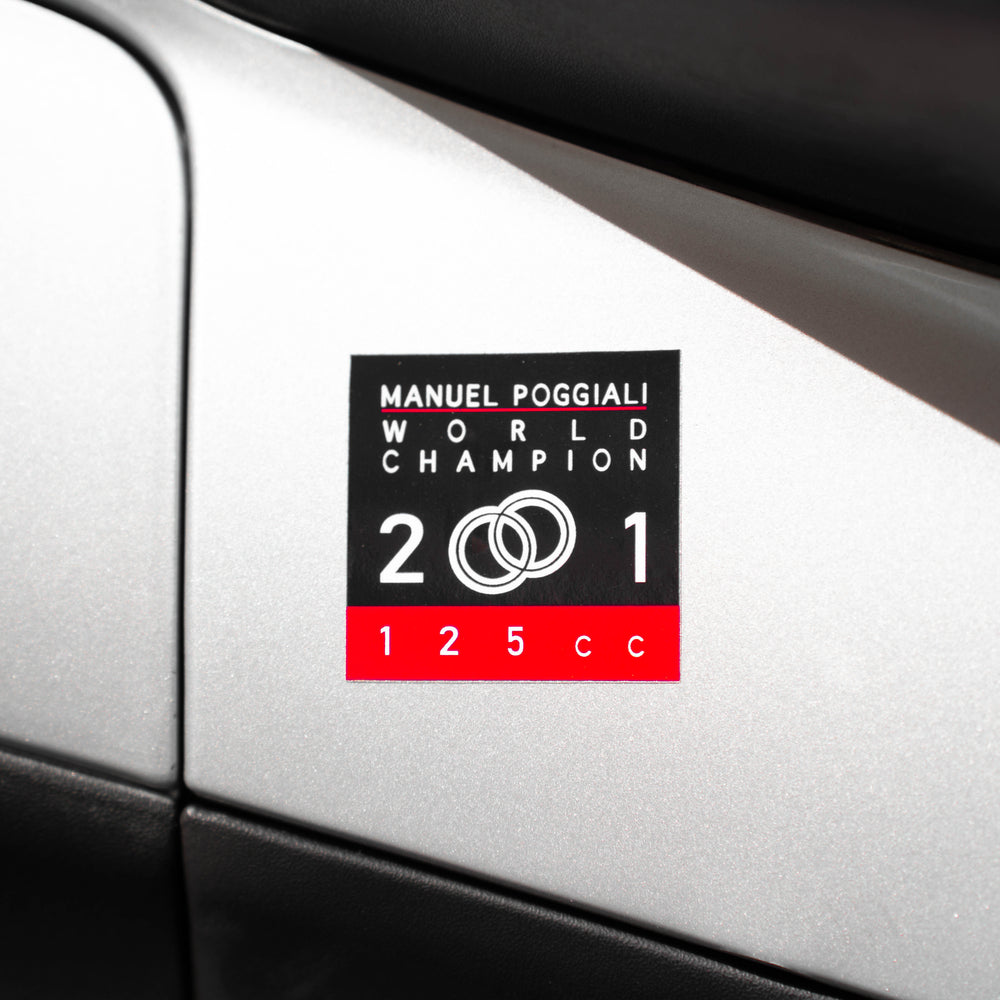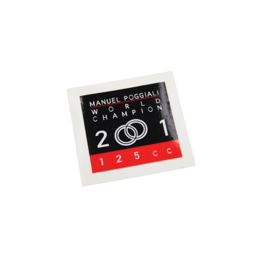 Manuel Poggiali World Champion 2001 Sticker Gilera Runner SP Pro – Originele, unieke sticker voor de rechter achterkap van de Gilera Runner SP Pro, net boven de treeplankmat. Deze zeldzame sticker is nergens anders meer verkrijgbaar en geeft je scooter de authentieke SP Pro look. Perfect voor restauratie of om je Runner een exclusieve uitstraling te geven.