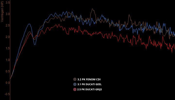 Phenom performance exhaust, Phenom CDI and a Malossi Multivar With 6.1 grams of rolls and a white pressure spring. Top speed 64 km/h GPS so on counter +-68 km/h! 3.2 HP on the test bench measured with a phenom CDI, with a Ducati CDI unlimited 3.1 hp and with a Ducati Gray CDI 2.5 hp.