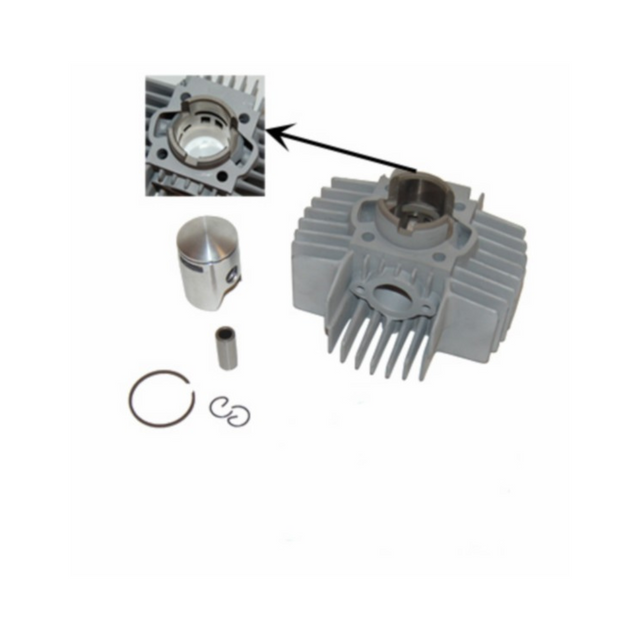 The DMP 6-port aluminum cylinder with a diameter of 38 mm is specially designed for the Puch Maxi. This cylinder offers improved performance thanks to the light and durable aluminum material, with six ports for more efficient air flow and optimum engine operation.