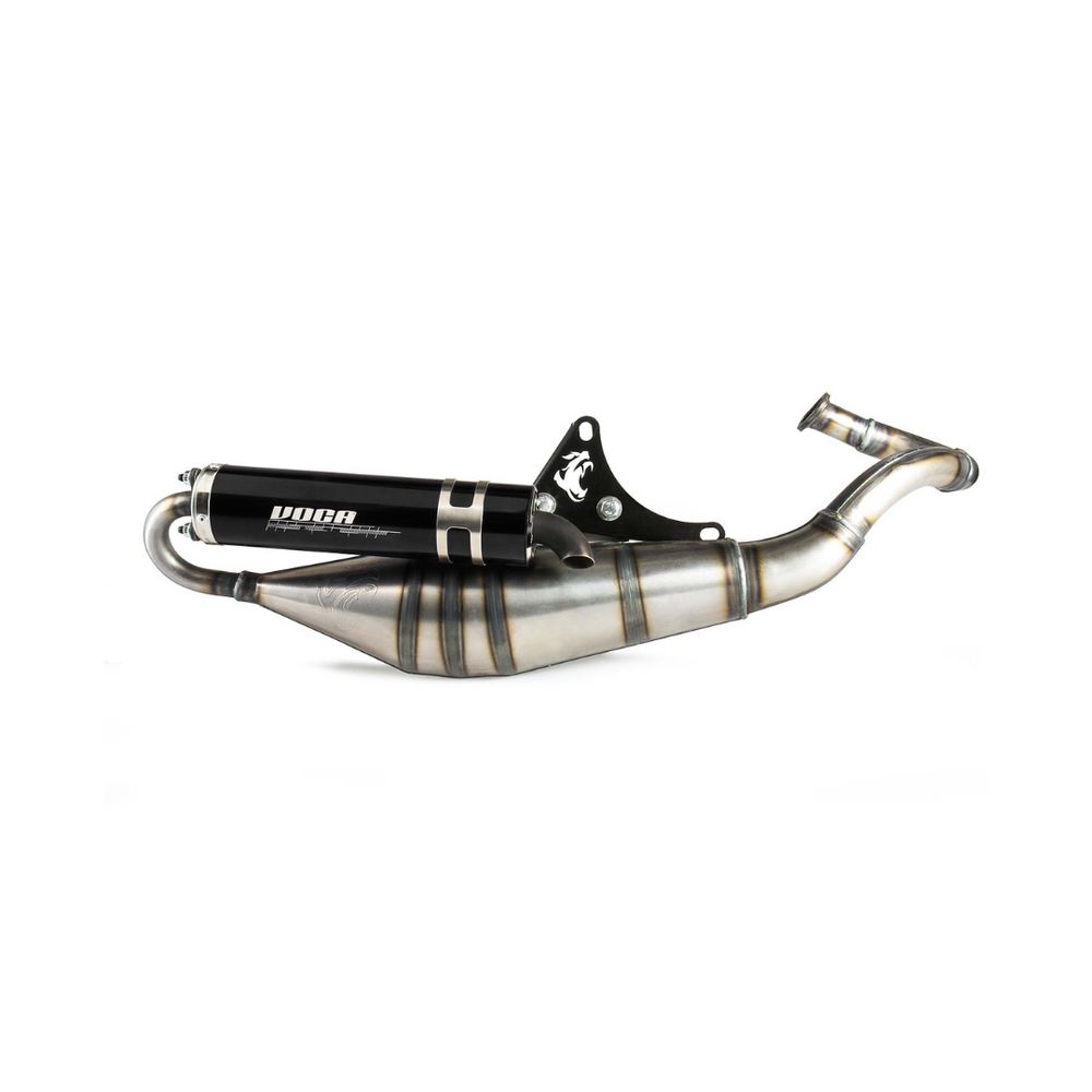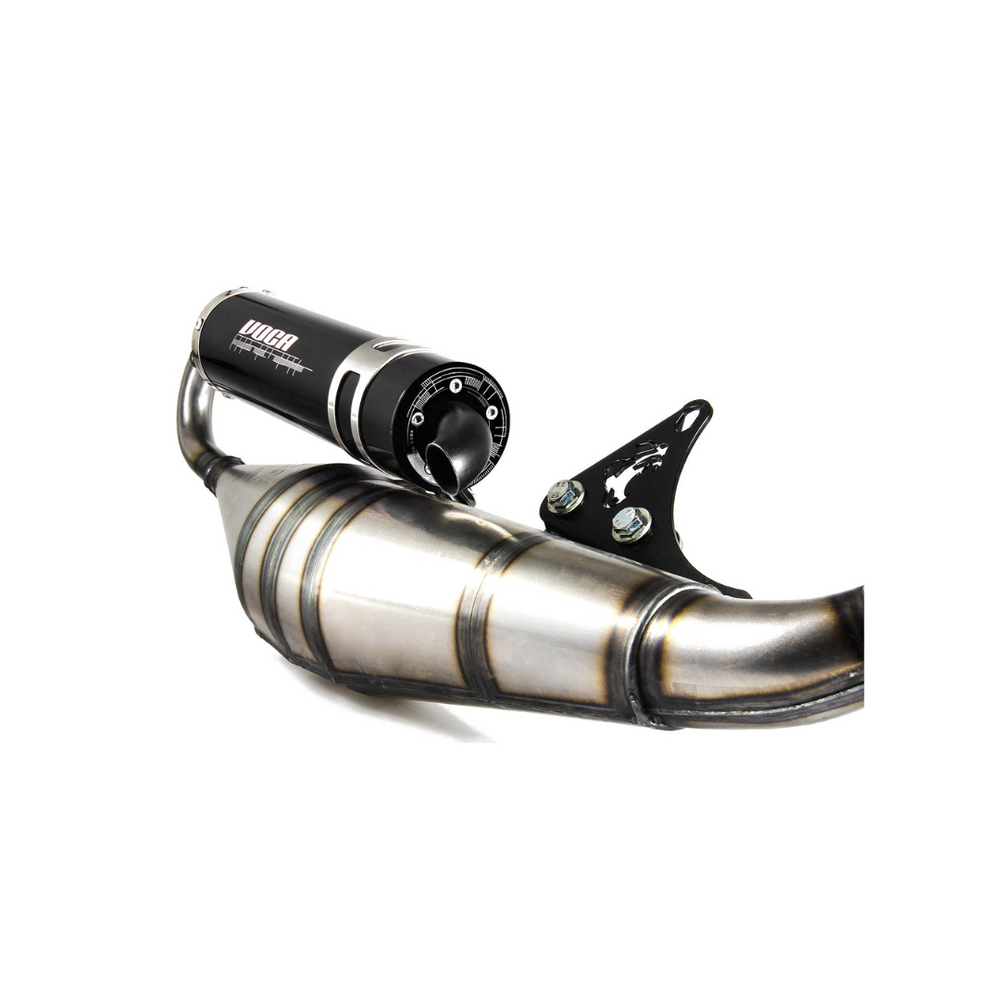 Exhaust voca 50/70cc black piaggio 2 stroke, the voca sabotage v2 exhaust system is an absolute all -rounder. With a 50cc standard cylinder, the voca sabotage V2 exhaust top performance reaches. With a 70cc sports cylinder, this voca exhaust system becomes a real powerhouse after removing the exhaust flange reduction (if the system is not used on public roads).