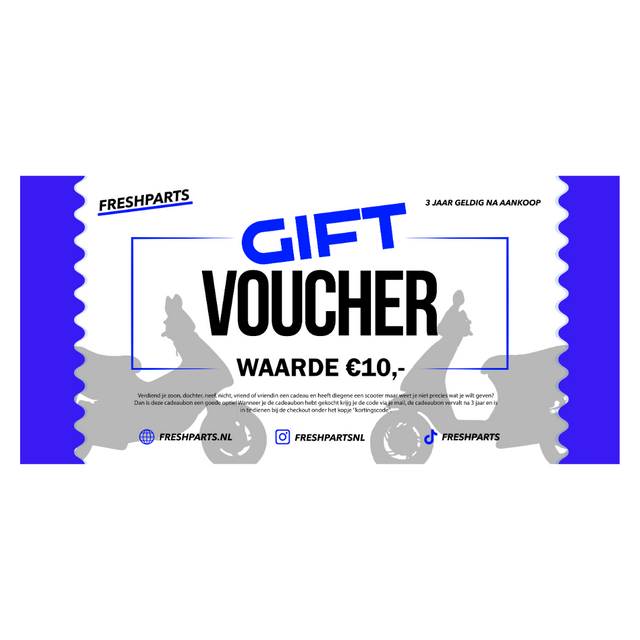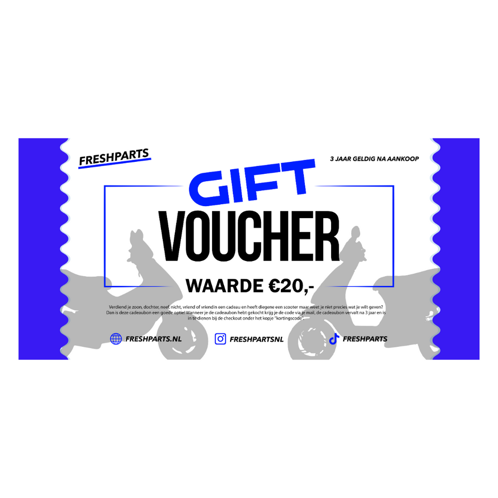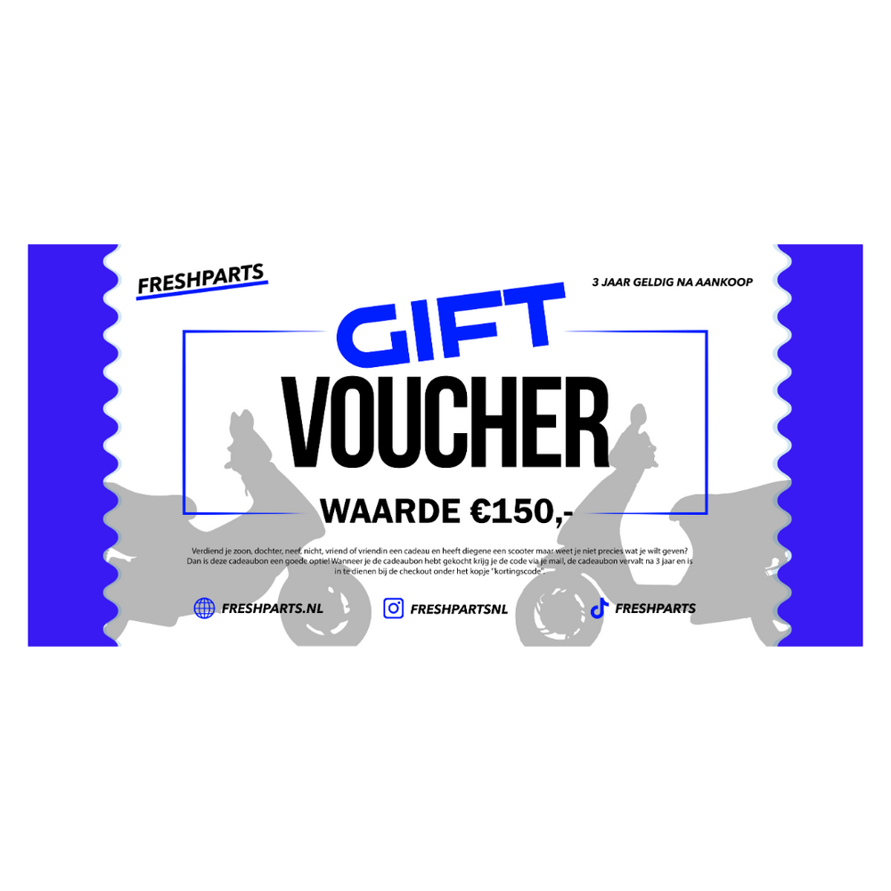 Tuo figlio, tua figlia, cugina, nipote, fidanzato o ragazza fa un regalo e ha uno scooter ma non sai esattamente cosa vuoi dare? Quindi questo buono regalo è una buona opzione! Quando hai acquistato il buono regalo riceverai il codice tramite la posta, il buono regalo non verrà mai cancellato (se lo hai completamente utilizzato) e può essere inviato al checkout sotto il "codice sconto".