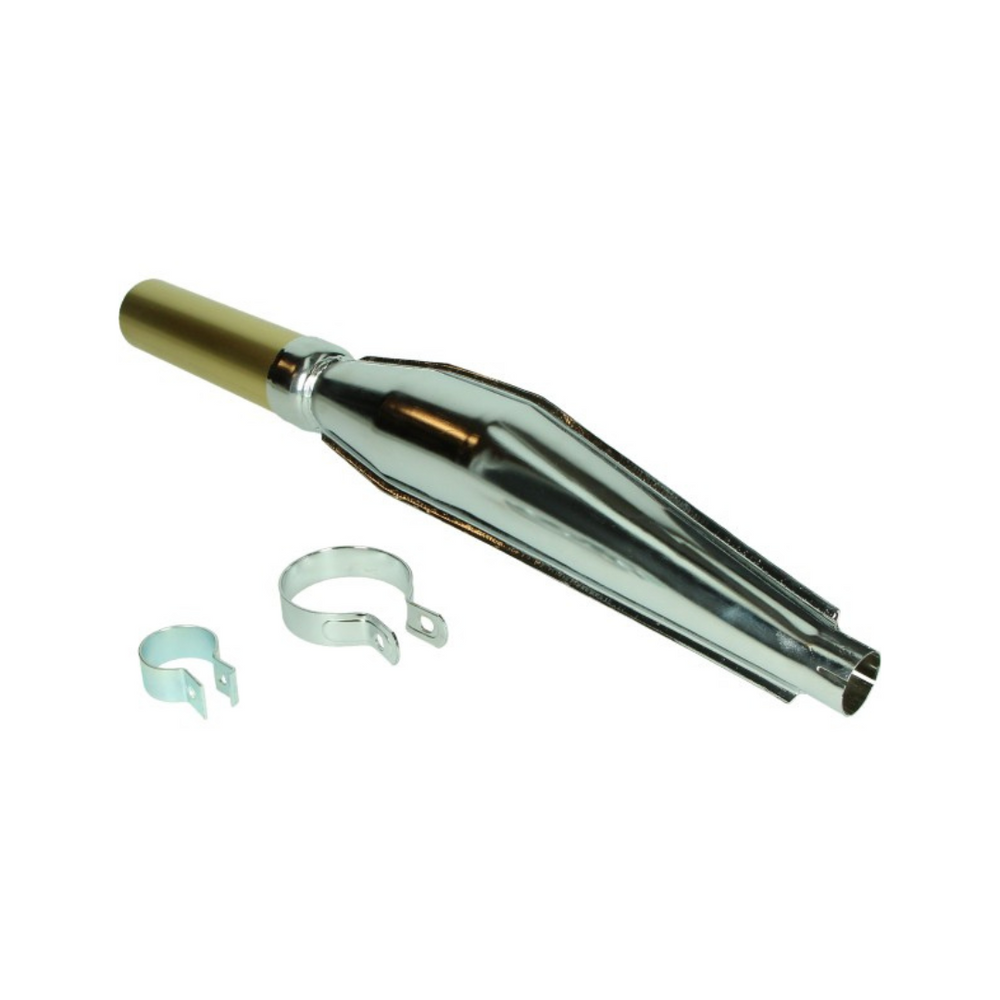 De Jamarcol Cross Uitlaat met een 32MM beugel in chroom/goud is de perfecte keuze voor motoren zoals Reidler, Puch, Puch Maxi en Zundapp. Deze uitlaat combineert een sportieve uitstraling met verbeterde prestaties. De chroom/gouden afwerking zorgt voor een luxe en opvallende look, terwijl de beugel zorgt voor een stevige bevestiging en betrouwbare werking. Ontworpen om de motorprestaties te optimaliseren, biedt deze uitlaat een betere luchtstroom en een krachtiger geluid.