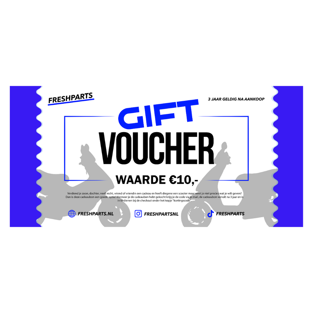 Votre fils, votre fille, votre neveu, votre nièce, votre petit ami ou votre petite amie méritent un cadeau et il possède un scooter mais vous ne savez pas exactement ce que vous souhaitez offrir ? Alors ce chèque cadeau est une bonne option ! Une fois que vous avez acheté le chèque-cadeau, vous recevrez le code par e-mail. Le chèque-cadeau n'expirera jamais (à condition que vous l'ayez entièrement utilisé) et pourra être soumis lors du paiement sous la rubrique « code de réduction ».